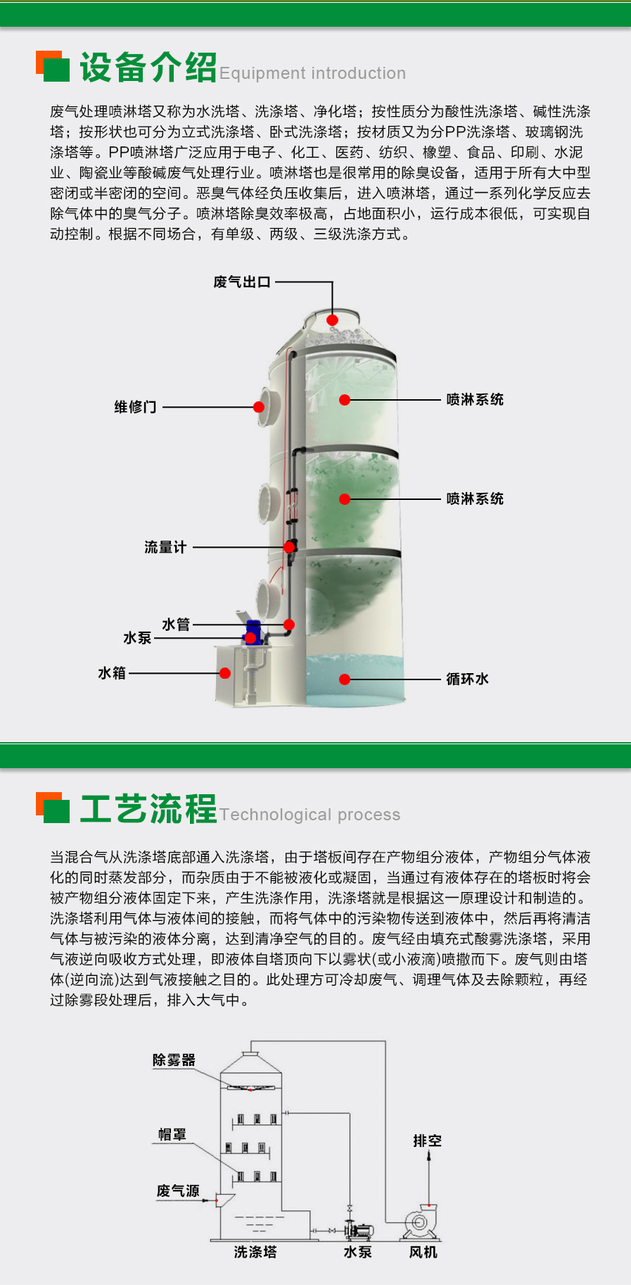 噴淋塔(俗稱:水淋塔)是一種處理煙塵廢氣的濕式環保設備,可適用于發電廠燃燒煙塵、鋼鐵廠、鍋爐燃燒、垃圾燃燒等煙塵廢氣處理,這類的煙氣粉塵容易溶于水,噴淋塔是處理這類煙氣粉塵的不二之選。煙氣粉塵從塔底進入塔內,塔內有填料支撐板,噴淋塔從塔頂噴出液體,液體均勻的分布在塔內和污染物充分接觸,達到凈化的效果,最后塔頂排出。