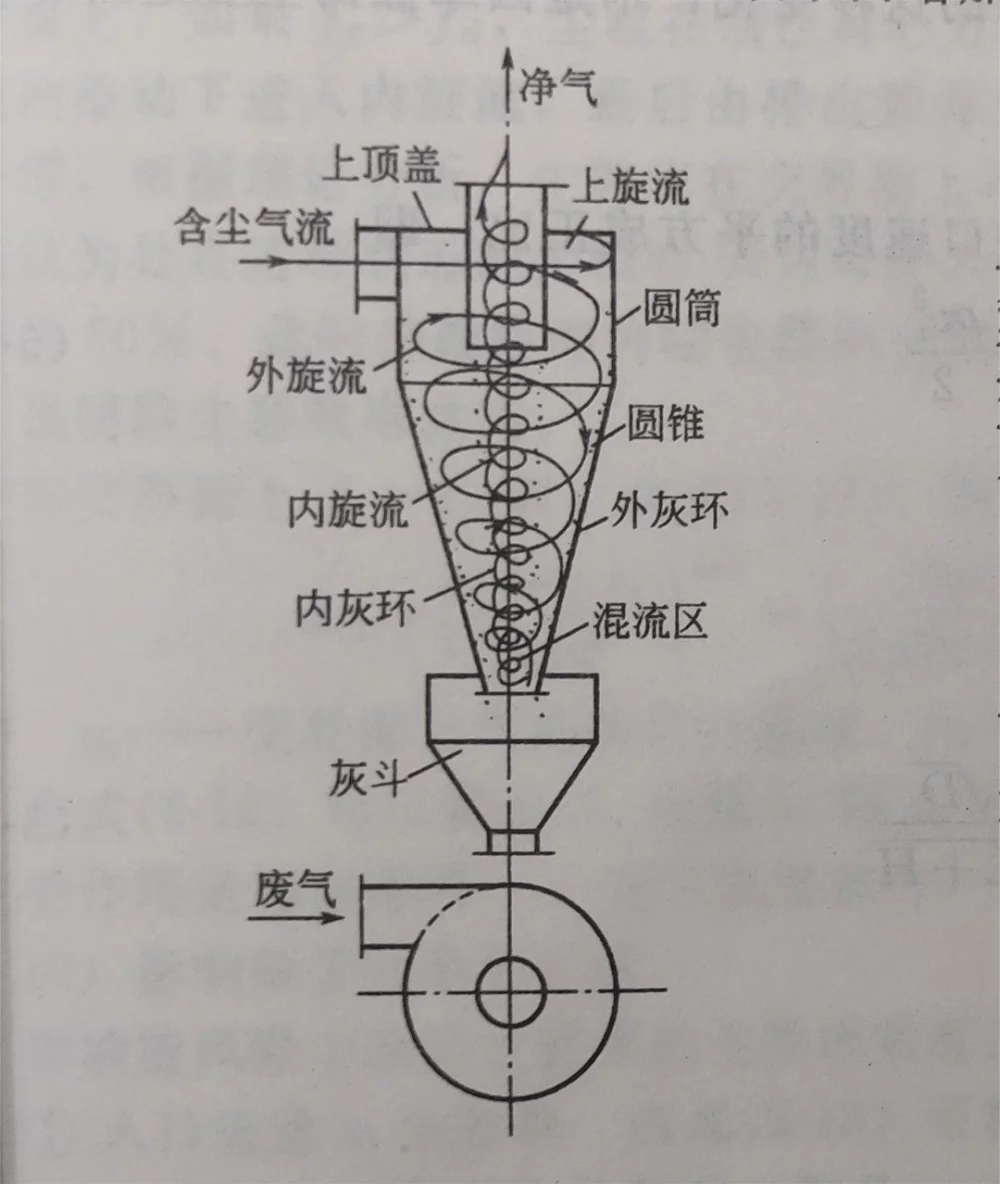 旋風除塵器由排風管、圓筒體、圓錐體、進風口、卸料閥、灰斗等部分組成