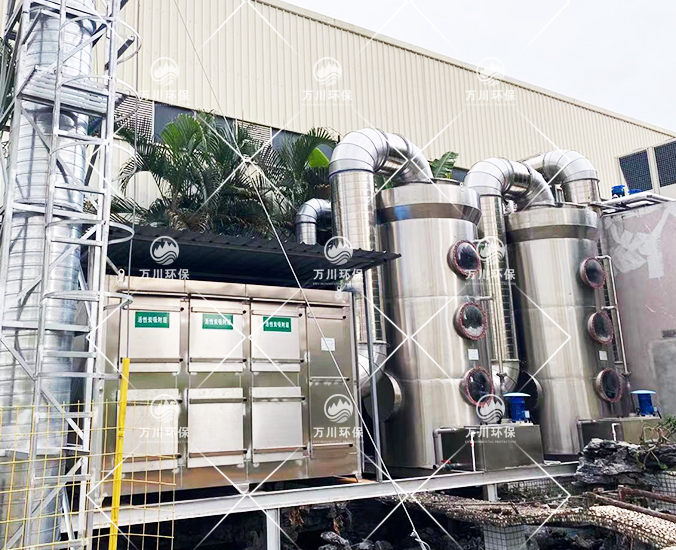 根據(jù)客戶需求和我司實(shí)地考察之后,最終采用‘兩級噴淋吸收法+活性炭吸附法’對其進(jìn)行處理。采用水噴淋一方面可以降溫,另一位方面能夠讓水吸一部分的有機(jī)廢氣,降低后續(xù)活性炭吸附的負(fù)荷。