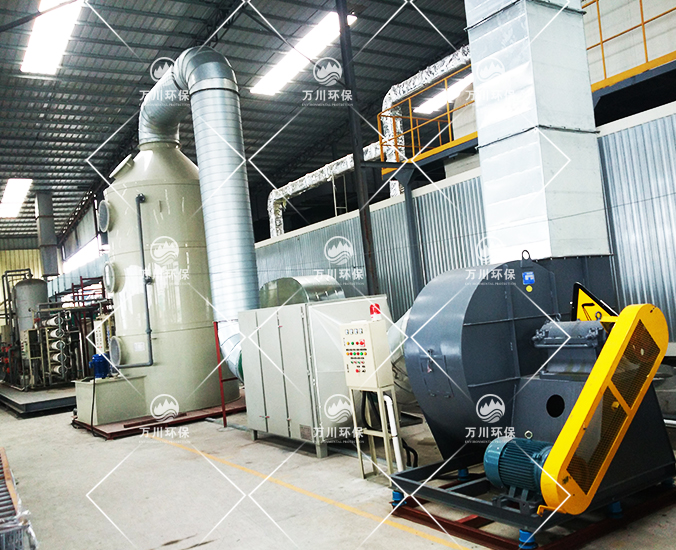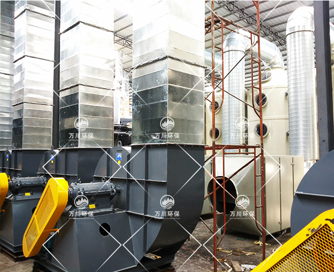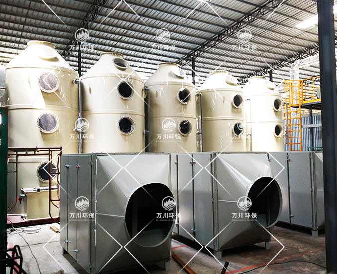 根據廠方提供的資料及現場勘察的情況。其噴漆廢氣的來源主要為無塵噴漆車間內的5條自動噴涂線。在生產過程中有噴漆,該工序產生了一定量含三苯有機廢氣和噴漆粉塵,該廢氣不僅對環境造成污染,而且對人體有較大的危害作用,同時也破壞了周邊的環境,造成了不良的影響,需進行處理后排放。我們工程師分析了該廢氣的特點和以往的案例經驗,采用了“水簾柜+噴淋塔+活性炭吸附塔”這套解決方案。