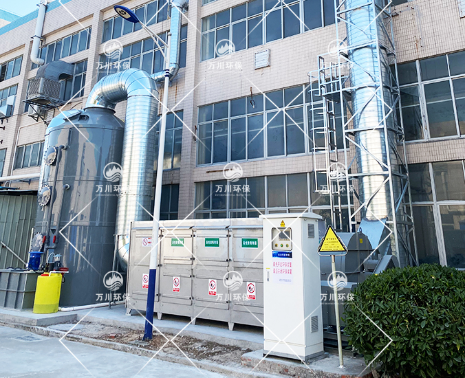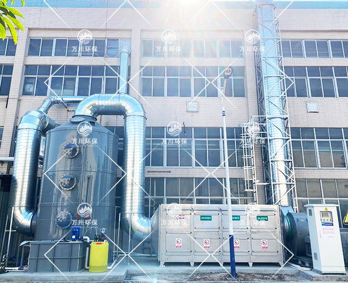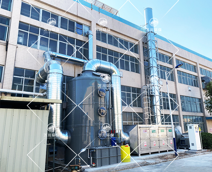 廢氣和粉塵經過集氣罩吸入至風管,以負壓的形式進入到噴淋吸收塔內,廢氣和粉塵進入塔內,塔內噴出吸收液,吸收液在填料層液膜,廢氣和粉塵充分地與液膜接觸,處理后的氣體經過塔頂的除霧層干燥后,可以直接排放或者進入后續的廢氣處理設備中進行處理。